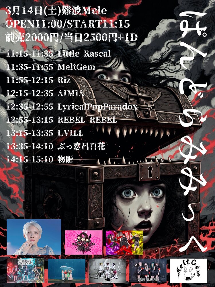 【大阪】ぱんどらみみっく Schedule 2026/03/14(土) 11:15 - 15:00 難波Mele 地図を表示 open11:00/START11:15 前売2000円/当日2500円+1D 【出演】 ぶっ恋呂百花(GUEST) / Riz / I.VILL / AIMIA / LyricalPopParadox / REBEL REBEL / Little Rascal / MeltGem チケットURL URLをコピーする 報告する