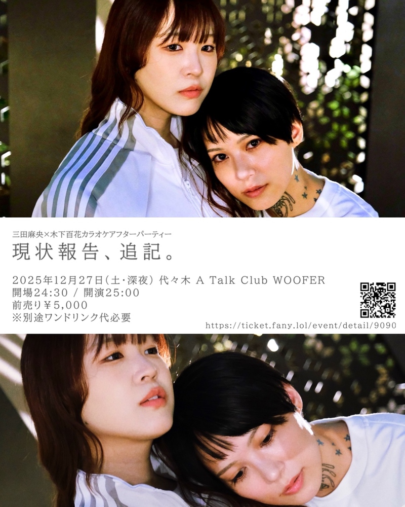 【代々木】現状報告、追記。 Schedule 2025/12/28(日) 01:00 - 04:00 代々木 A Talk Club WOOFER 地図を表示 【出演】 三田麻央 / 木下百花 【日時】 2025年12月27日(日・深夜) 開場24:30/開演25:00 【料金】 前売り5,000円(+1D) 三田麻央×木下百花カラオケアフターパーティー チケットURL (11/9(日)10:00〜販売開始) URLをコピーする 報告する