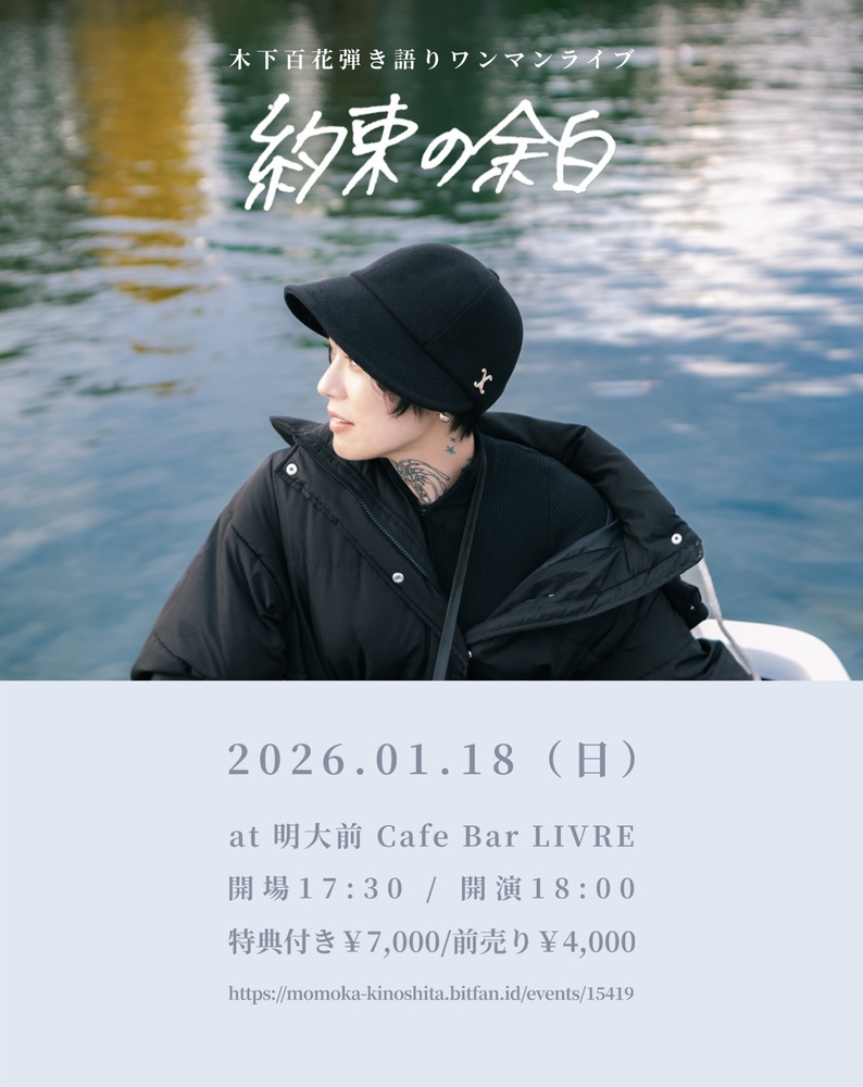 【明大前】弾き語りワンマンライブ「約束の余白」 Schedule 2026/01/18(日) 18:00 - 20:00 明大前 Cafe Bar LIVRE 地図を表示 【時間】開場17:30/開演18:00 【料金】特典付き 7,000円(+1D) / FC先行4,000円(+1D) 【出演】 木下百花(弾き語り) チケットURL URLをコピーする 報告する
